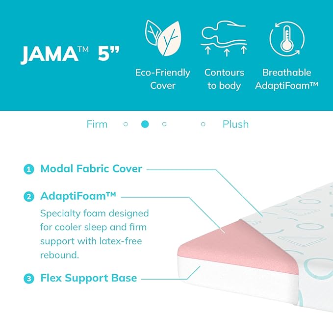 - Medium Firm with Exclusive Memory Foams: Adaptifoam is a specialized open-celled foam that enhances breathability and airflow. It provides children with multiple layers of contouring support and comfort while minimizing the bounciness commonly associated with innerspring mattresses. The exterior modal fabric, derived from beech-tree pulp, is soft and durable.