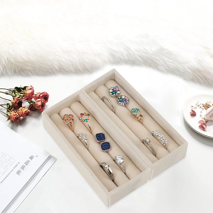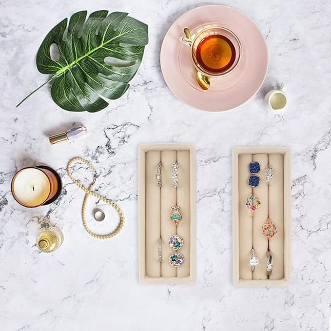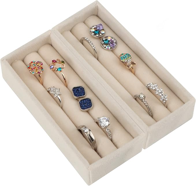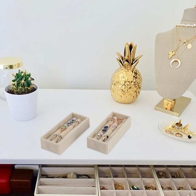 DesignSter Small Jewelry Tray, 2PCS Ring Organizer, Velvet Jewelry Display Tray, Stackable Jewelry Organizer Trays, Jewelry Drawer Organizer Inserts For Dresser, Jewelry Box (Beige)