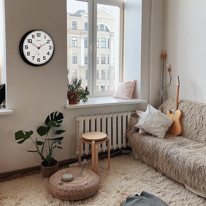 Sharp Atomic Analog Wall Clock - 12" Black Stylish Frame - Sets Automatically- Battery Operated - Easy to Read - Easy to Use – Modern Design and Style