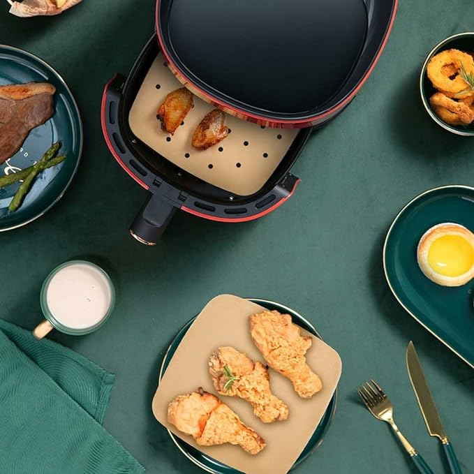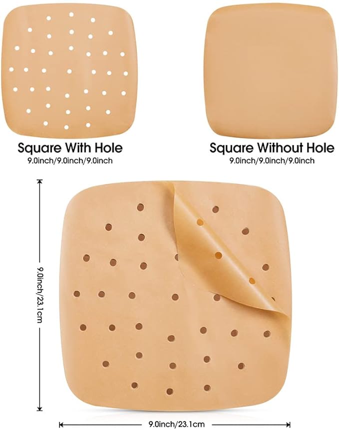 - 【Air Fryer Liner Size】Our 9-inch square air fryer parchment paper liners are meticulously designed to snugly fit 9 to 10-inch square air fryers. But that's not all! They're also a great match for cake pans, microwave ovens, and conventional ovens. Even for 11 to 10-inch oval air fryers (measured by diagonal length) or 11-inch round air fryers and metal steamers, these liners adapt like a charm, ensuring versatility in your kitchen appliances.