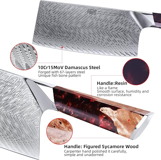- Material - The blade was constructed of 10Cr15CoMov Damascus steel. Premium metal, sharp and durable, not easy to rust. Handle was made of red Resin and Figured Sycamore wood. A unique design, elegant and exquisite.