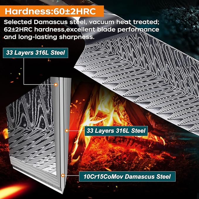 - Advantages - Our knife was made of 10Cr15CoMov, which is a Chinese stainless steel equivalent to Japanese VG10 steel. 10Cr15CoMoV steel has a hardness of 59-62 HRC as per the Rockwell hardness scale. It keeps a sharp edge and the ability to resist abrasion. 10Cr15CoMoV contains enough chromium to fight corrosion, it does not easy to rust. It can be effectively used in humid, wet, and salty environments. Proper care for this steel is as simple as cleaning and drying the blades after use.