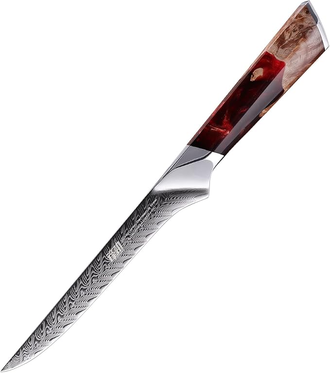 FINDKING Nebula Series Boning Knife, Versatile Deboning Knife, 10Cr15CoMov Damascus Steel Blade, Resin and Figured Sycamore Handle, Full Tang, 5.5 Inch, Red, for Skinning, Removing Fat, Filleting