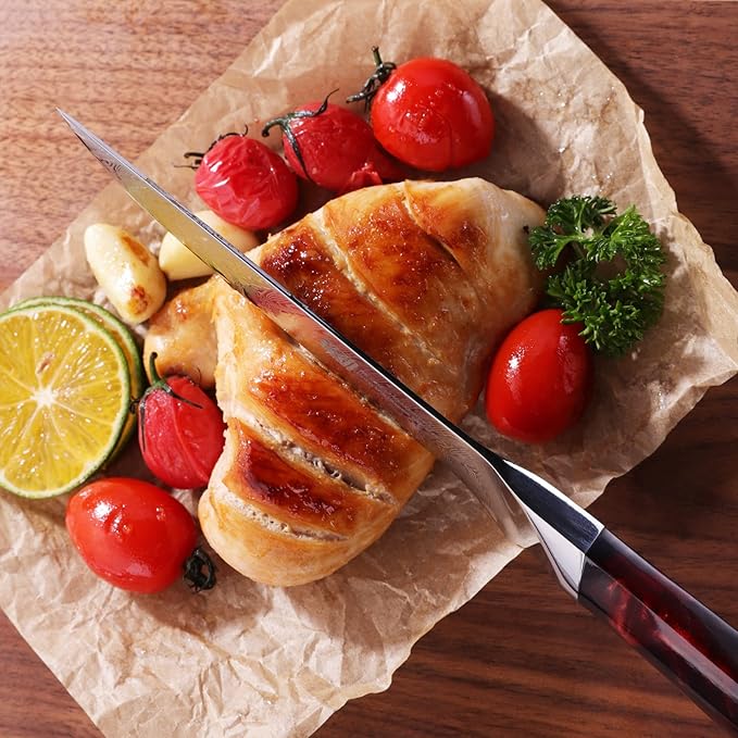 - Material - The blade was constructed of 10Cr15CoMov Damascus steel. Premium metal, sharp and durable, not easy to rust. Handle was made of red Resin and Figured Sycamore wood. A unique design, elegant and exquisite.
