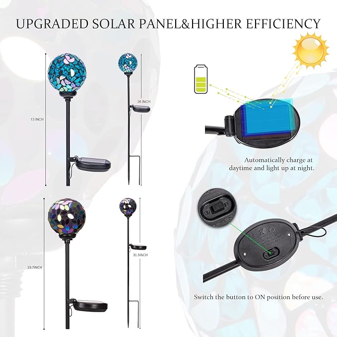 - Mosaic Globe Design:Mosaic solar garden lamp adopts hand-made color flower petal glass fragment design, solar ball light makes your garden more beautiful and elegant. Ideal choice of outdoor decorative lamp