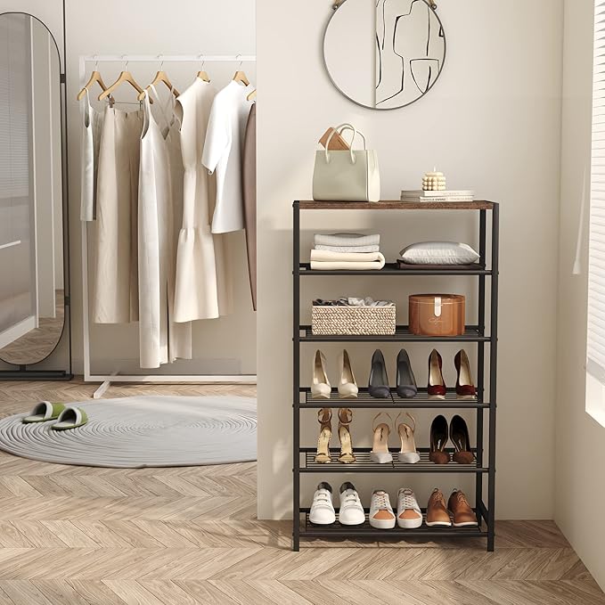 HOMEFORT Shoe Rack 6-Tier, Shoe Storage Shelf, Industrial Shoe Tower, Narrow Shoe Organizer for Closet Entryway, Small Shoe Rack Table with Durable Metal Shelves, Rustic Brown
