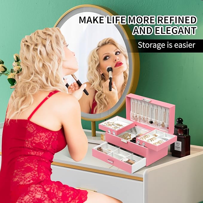 Dajasan Jewelry Box for Girls Women, PU Leather Jewelry Organizer Box, 3 Layers Jewelry Gift Box for Christmas, Valentine's Day, Birthday, Mother's Day (Pink)