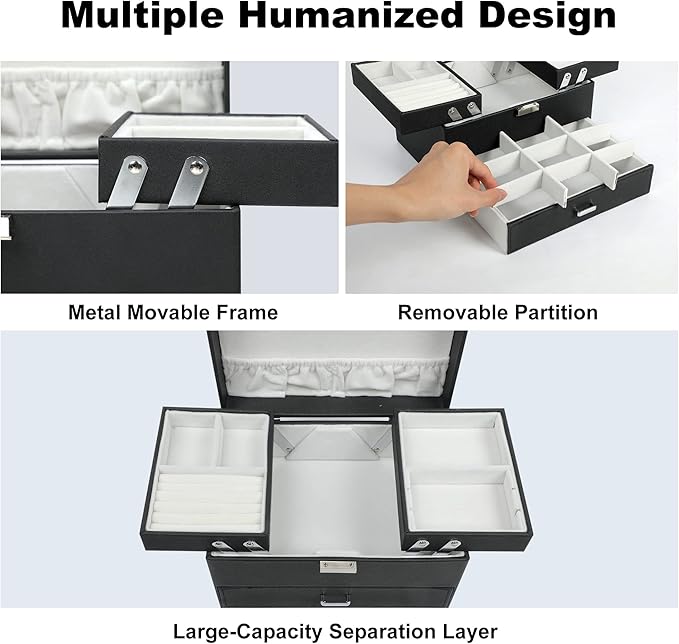 - 3 Layers of Large Capacity: The large jewelry storage box has 5 ring slots, 9 ring boxes, 10 necklace hooks, 26 ear stud holes, 2 adjustable space compartments, when you stretch them out, you will find a large compartment hidden underneath, a large space for large pieces of jewelry you want to put. The jewelry organizer box has a variety of designs and compartments, which can store all your jewelry, whether it is a large piece of jewelry or a small earring, there is a place to store it