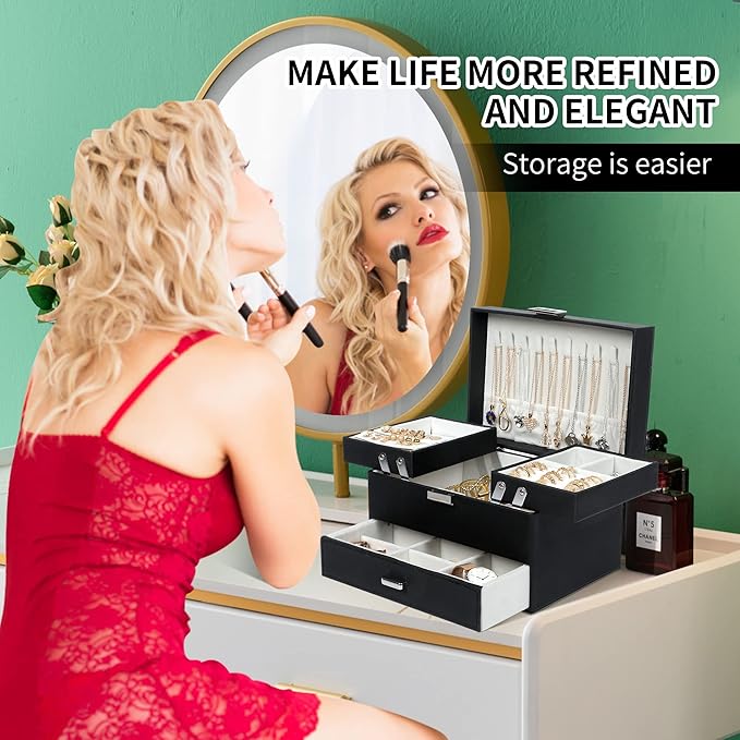 Dajasan Jewelry Boxes for Women Girls, Jewelry Organizer Box, 3 Layers Jewelry Storage Organizer for Earring, Ring, Necklace, Bracelets (Black)