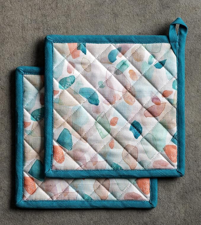 - Package includes: 2 pot holders measures 8"x8". Ideal as a hot pad for dishes, coffee pots, cast iron pans, or cookware. Designed in Europe and Made in India, it blends style, function, and comfort into a daily kitchen essential