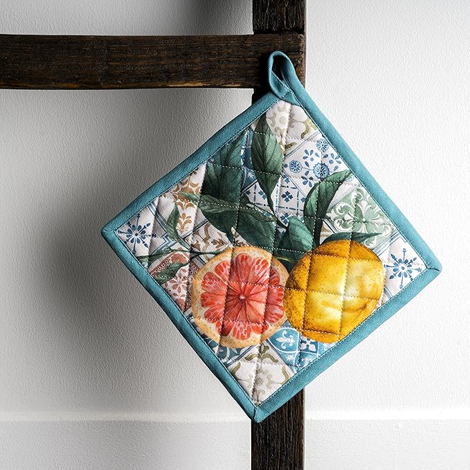 Maison d' Hermine Pot Holders Set 100% Cotton Heat Resistant Potholders 8" x 8" Hot Pads with Loop BBQ, Cooking, Baking, Grilling, Kitchen, Handling Hot Pans Spring/Summer (Pack of 2, Agrume)