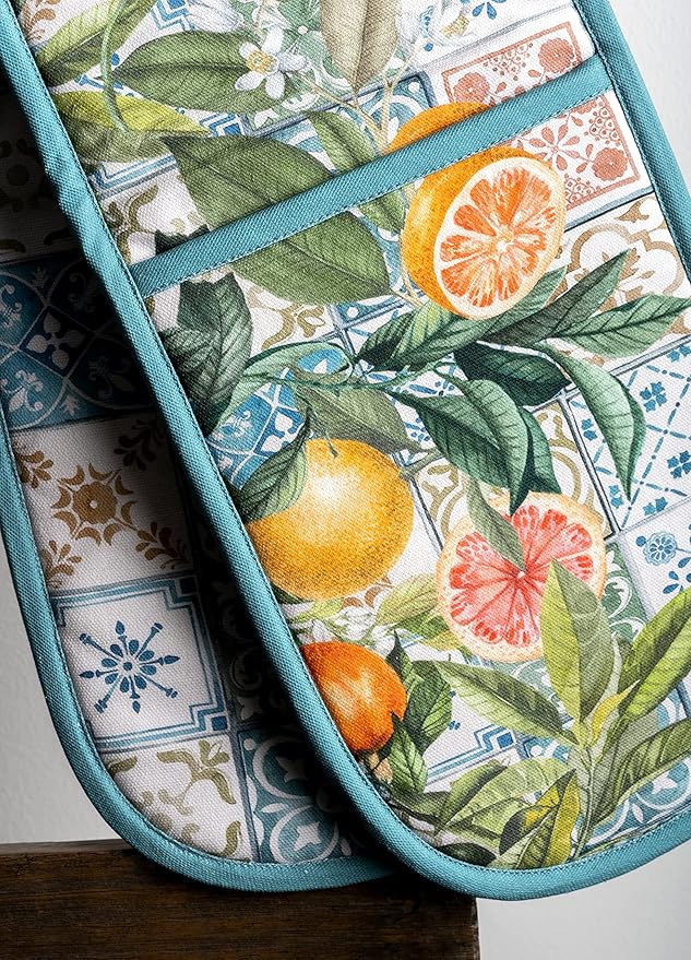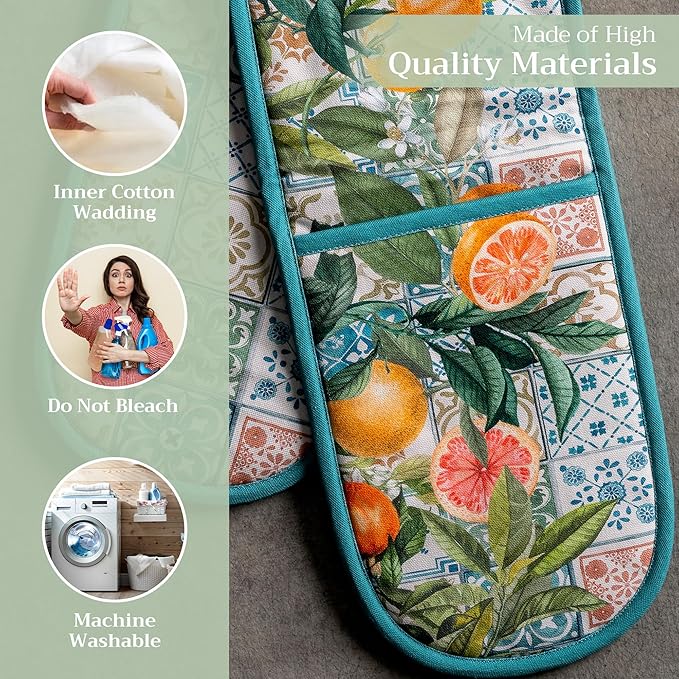 Maison d' Hermine Double Oven Mitts 100% Cotton 7"x35" Double Oven Mitt Heat Resistant BBQ Cooking Gloves with Loop, Baking, Grilling, Home, Kitchen, Handling Hot Pans Spring Summer (Agrume)