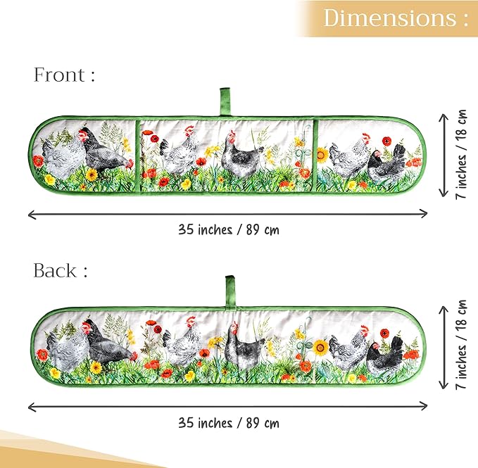 - Package includes: Includes 1 double oven mitt sized 7"x35". Perfect for handling hot cookware safely while adding a touch of European elegance to your kitchen. Designed in Europe and made in India with care