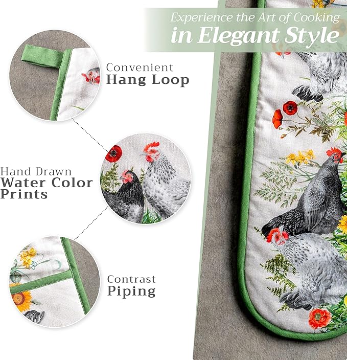 Maison d' Hermine Double Oven Mitts 100% Cotton 7"x35" Double Oven Mitt Heat Resistant BBQ Cooking Gloves with Loop, Baking, Grilling, Home, Kitchen, Handling Hot Pans Spring Summer (Basse Cour)