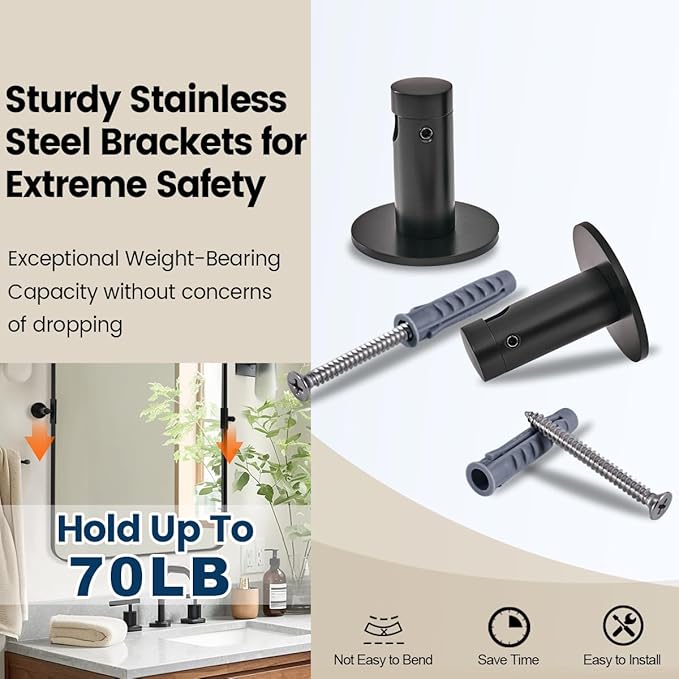 - 【OWN DESIGN SLEEK LOOK】 Several updates have been made through two years to enhance the tilting angle and safety and convenience of installation. With a simple, wide design and functional details, this black pivot bathroom mirror brings a designer look to the bath.