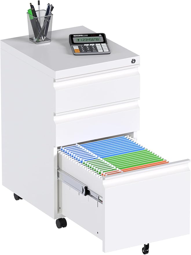 3 Drawer Mobile File Cabinet with Lock, Under Desk Metal Filing Cabinet for Hanging Files Letter/Legal/A4 Size for Home Office, Fully Assembled Except Wheels, White