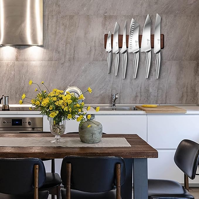 - 【New Kitchen Knife Set】DDF iohEF provides: 16 inch magnetic knife holder, 8 inch chef knife, 7 inch santoku knife, 8 inch bread knife, 6 inch utility knife, 7 inch fillet knife, 3.75 inch paring knife, sharpening steel. The new knife set for kitchen will give you a different experience to meet your professional and daily kitchen cutting needs.