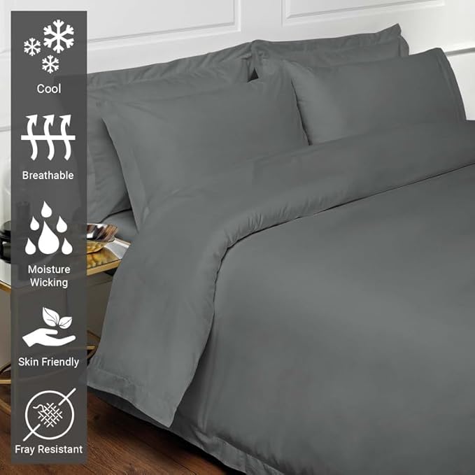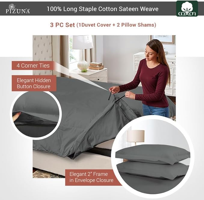 Pizuna Pure 100% Cotton Full Duvet Cover Set, Luxurious 400 Thread Count Long Staple Cotton Sateen Weave with Button Closure (Combed Dark Grey Cotton Duvet Cover Full)