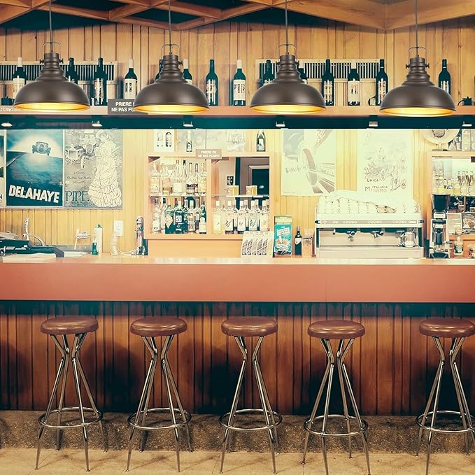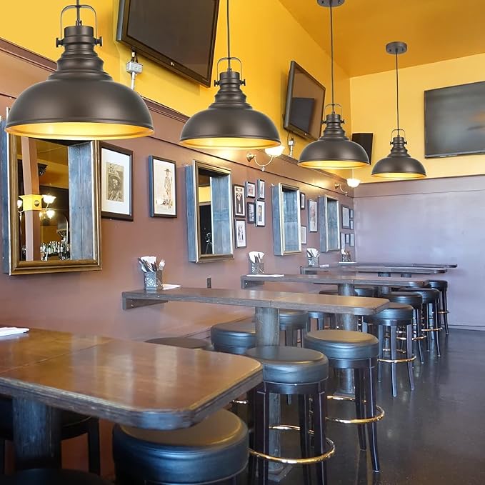 - INDUSTRIAL & VINTAGE DESIGN: 1-Light Pendant lighting for kitchen island, Oil Rubbed Bronze Finish Featuring retro-style dome shade, this farmhouse pendant lighting for kitchen is made of sturdy metal construction in oil rubbed bronze finish and inner gold finish The island lighting fixtures hanging is ideal for home, dining room, kitchen island, warehouse, entryway, corridor, restaurant, cafe, bar, club, barn, working bench.Plus, itβs compatible with a dimmer switch, so you can set the ideal mood.