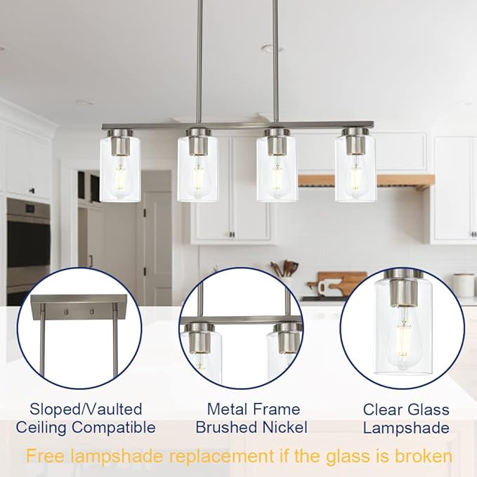Modern Kitchen Island Light with Clear Glass Shades, 4-Lights Hanging Lighting Fixtures in Brushed Nickel for Dining Room