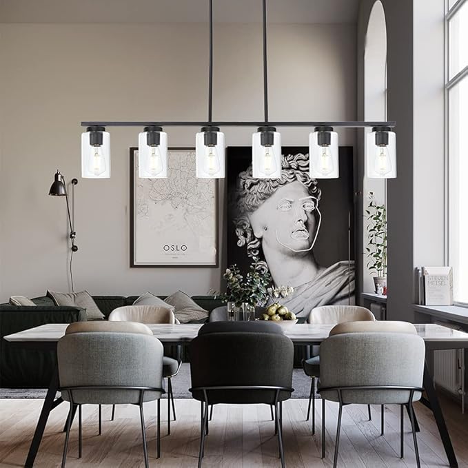 Black 6-Lights Kitchen Island Light with Clear Glass Shades, Farmhouse Hanging Pendant Light Fixture for Farmhouse Dining Room Living Room