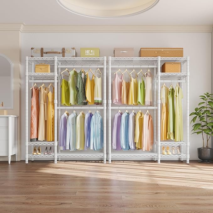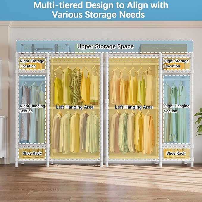 - 【Well-Organized Garment Rack】Double hanging rod is for hanging dress, suits, shirts, pants without wrinkle. And 4 tiers storage shelves provide enough place for handbag, hat, fold clothes, storage box, bedding. Say goodbye to messy!