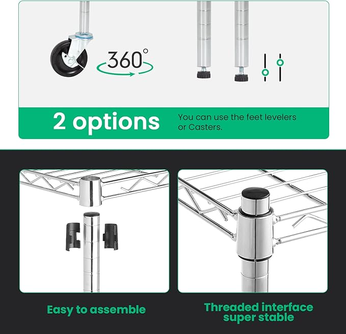 - Locked Wheels:The casters are very sturdy and high-quality, easy to move; The wheels of the shelf are equipped with fixed locks, which can be fixed or moved at any time; For example, when you need to push a metal storage rack into a kitchen, garage, or office, etc;, you can unlock it; If you want to fix the heavy metal shelf in place, you can lock it
