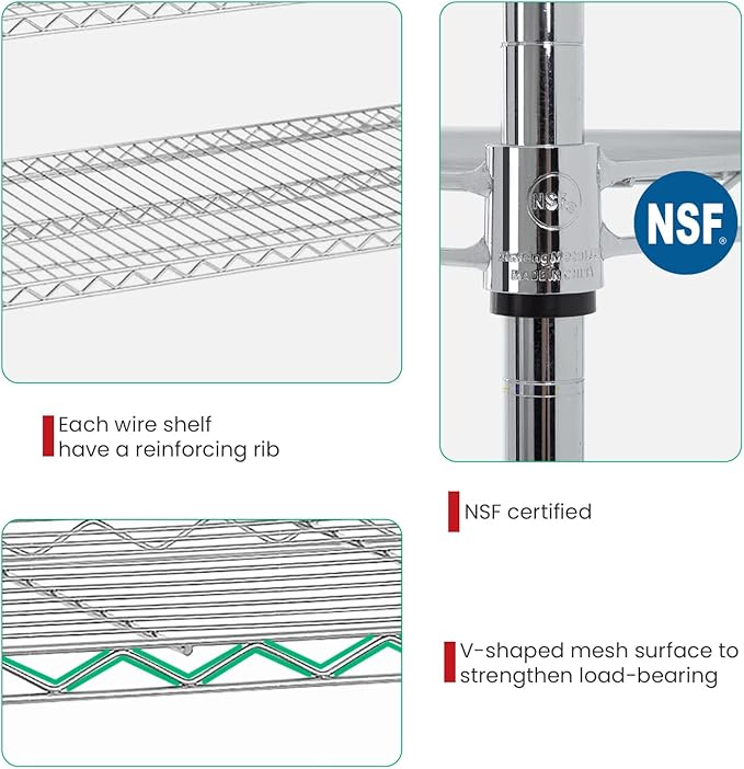- Multiple Usage:The metal shelf with super storage function can be placed in the kitchen, bathroom, room, living room, warehouse, office, industry, commercial exhibition, hotel, supermarket, etc