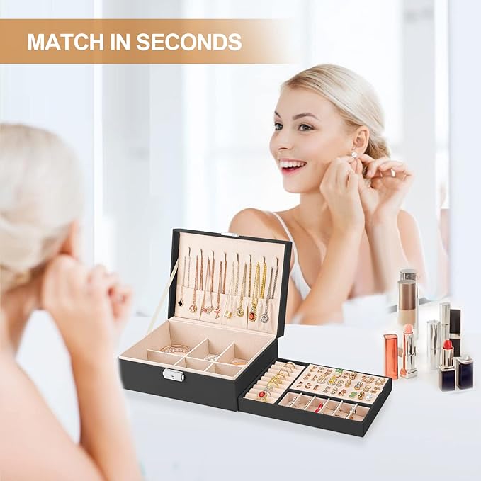 - 【FIND YOUR TODAY MATCH INSTANTLY】 Find your favorite accessories in seconds. The jewelry box displays your jewelry neatly and stylishly, which can better classify jewelry. No more messy, damaged or misplaced. Jewelry organizer box will keep your jewelry orderly organized and easily accessible. No more struggling to find where your matching pieces are everyday. Gets your daily dressing up quicker and easier.