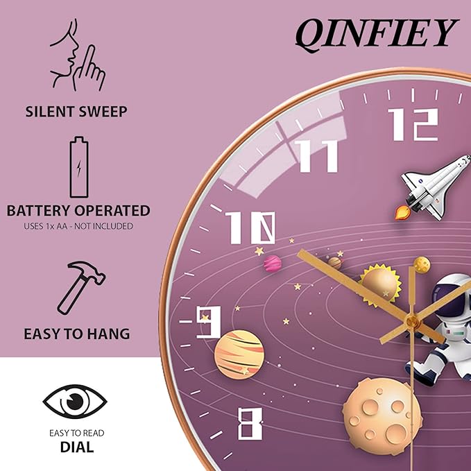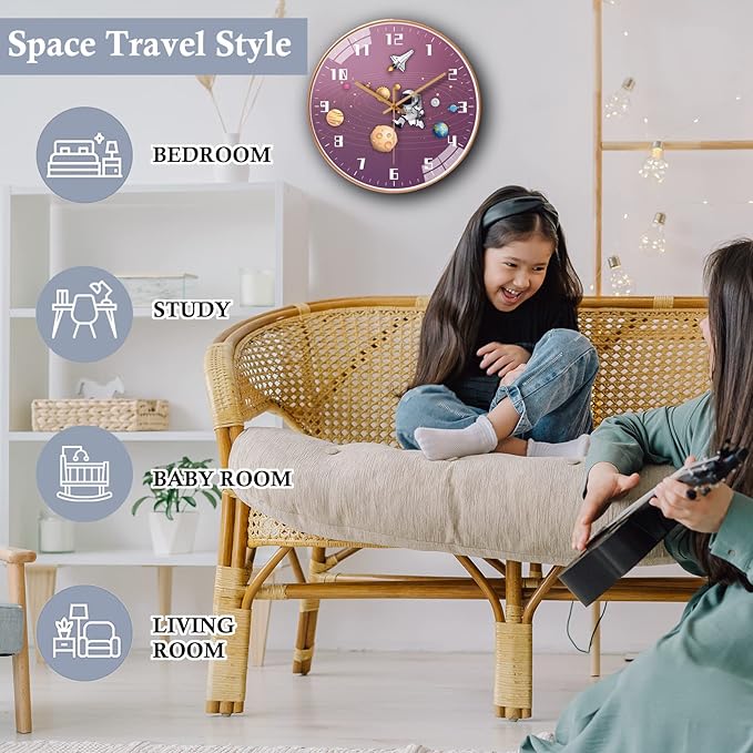 12 Inch Silent Movement Kids Wall Clock, Non Ticking Children Round Wall Clock Battery Operated Space Travel Style Decor Children Clock for Home School Girls Bedroom Living Room (Pink)