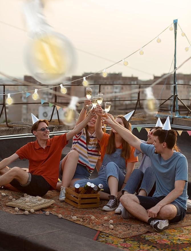 - Vintage Style Globe LED Lights: This retro led string light can send warm white light when you install it in the garden, tents, courtyard, making your mood very happy. Perfect decorative string lights for bedroom, living room and outside space like rooftops, deck, tent, porch, pergola, market, umbrella, balcony. Add a relaxed and romantic ambience to your party, camping, wedding