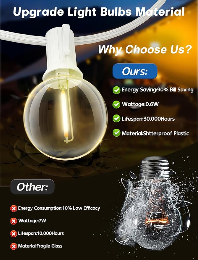 - Shatterproof & Dimmable Lights: G40 led bulbs are made of plastic which much shatterproof than traditional glass incandescent bulb. Low working temperature, safer to touch. G40 globe led string lights are dimmable, dimmer is required for dimming(NOT Included dimmer). Commercial grade high quality are perfect for permanent outdoor lighting