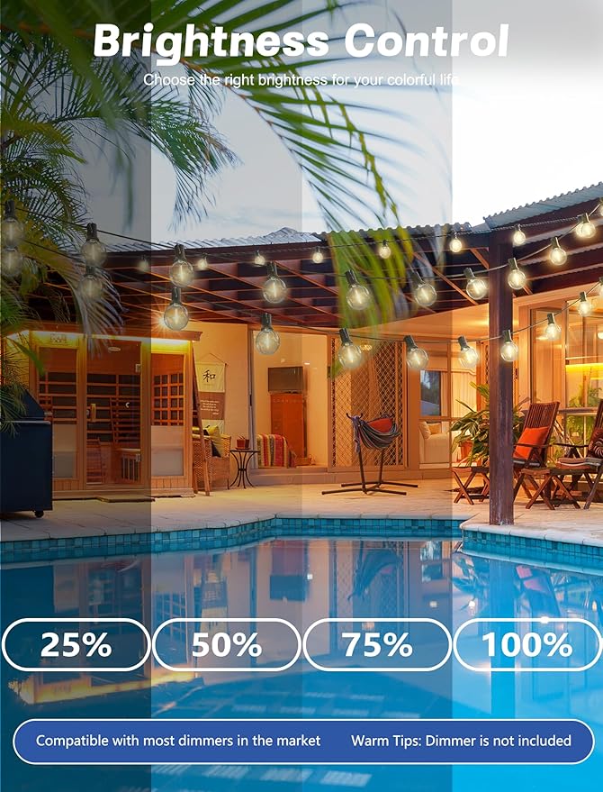 - Easy to Install: 100Ft globe led string lights, Outdoor hanging string lights come with 50 G40 led globe bulbs and 2 spare bulbs. The patio string light is easy to install that each light socket has a clip to fix or place the light string to anywhere as your need