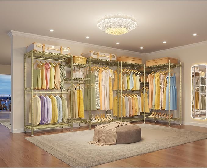 - Multifunctional Closet Rack: This clothing rack comes with 7 adjustable shelves and 4 hanging rods to accommodate a range of clothing items. The height of shelves is adjustable with the easy-to-use slip-sleeve locking system. You can move it higher or lower according to your clothes length.
