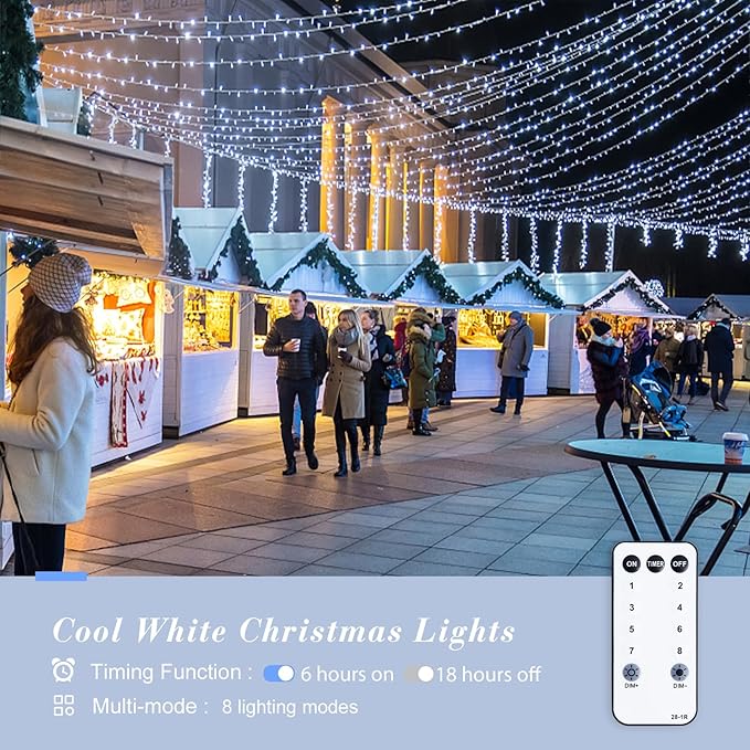- 【Remote Control String Lights for Outside】Our upgraded string lights come with a wireless remote control that offers 8 lighting modes, dimming options including 4 adjustable brightness levels, and timer functionality. The effective range of the remote control is up to 10 feet, please point the remote control towards the adapter. Each lighting mode creates a unique atmosphere that enhances your Christmas tree and holiday celebrations.