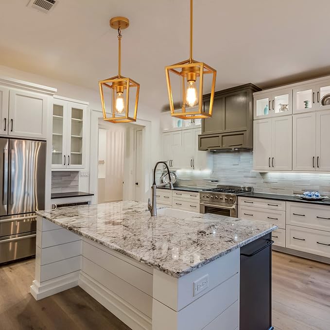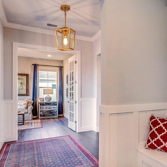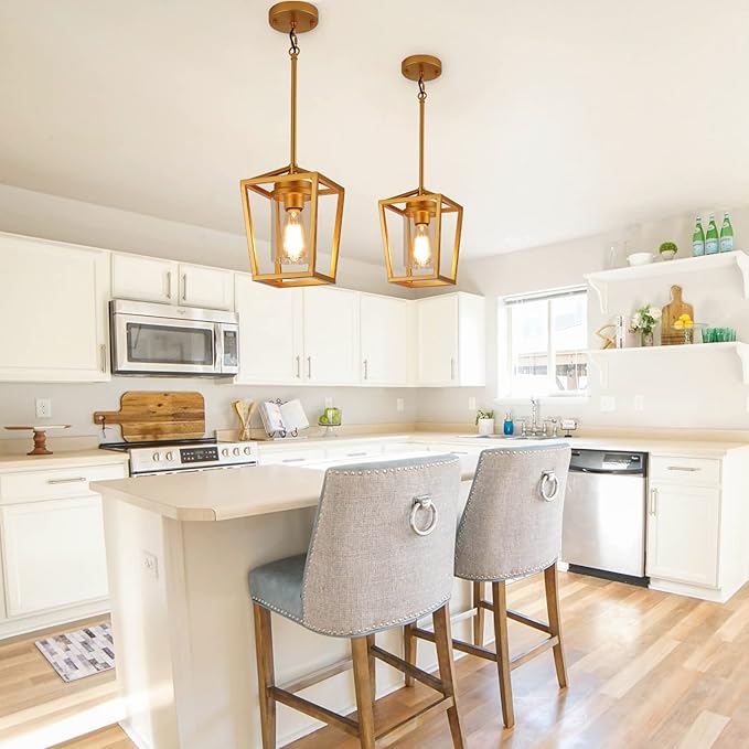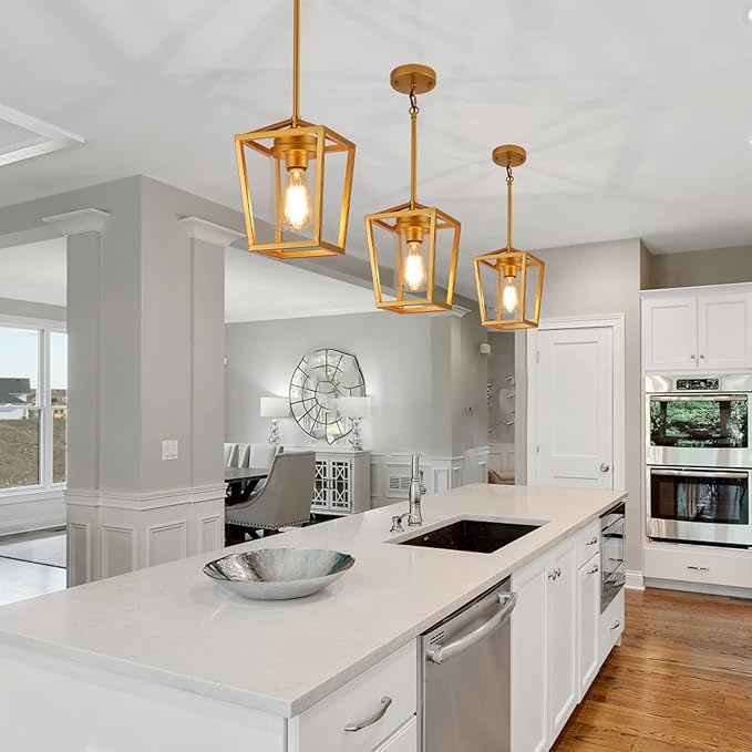 - Painted Gold Lantern Pendant Light: Our 1-light geometric pendant light fixture is updated with a brass finish in classic lantern geometric outline for a modern farmhouse look. The clear glass shade of the brass pendant light create a beautiful glow to illuminate your space. Ideal for accenting any open space in your house such as entrance, kitchen, etc.