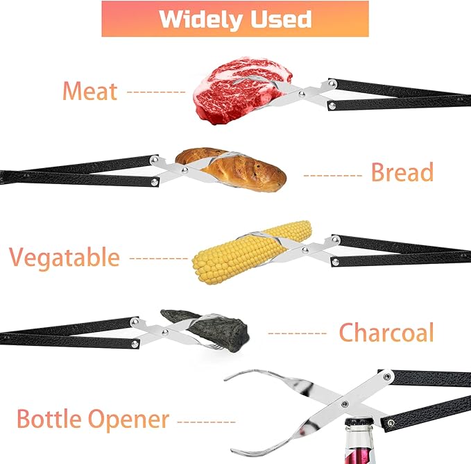 - Extra Long Handle --- This scissor-like grill tool with 20 inches of lengthensures that your hands never get burned while at high temperatures, even when moving food at the back of the grill. It's also used as a universal tong, kitchen tong, coal or wooden tongs, suitable for barbecue, camping, picnic and other outdoor activities