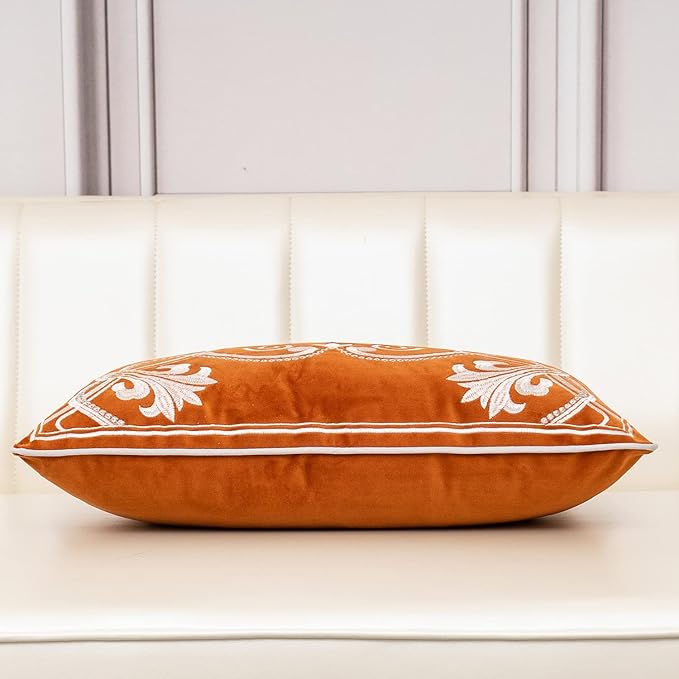 Aeckself European Luxury Velvet Lumbar Throw Pillow Cover 12 x 20 Inch, Embroidery Floral Pillow Cover Home Decor Oblong Pillowcase for Couch Bedroom Living Room, Burnt Orange and White