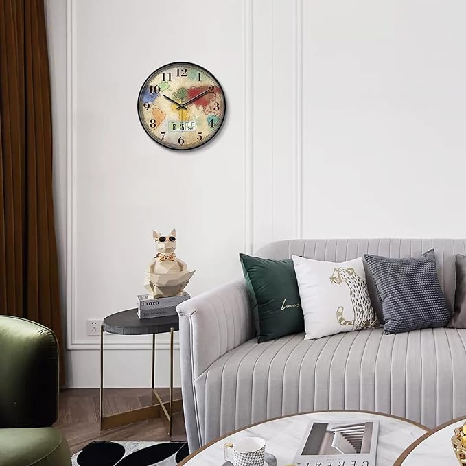 Modern Round Retro Digital and Analog Wall Clock Silent Calendar Colorful World Map Vintage Clocks with Date and Temperature Week Quiet Non-Ticking Kid Room Office Kitchen Decor for Bedroom 12 Inch