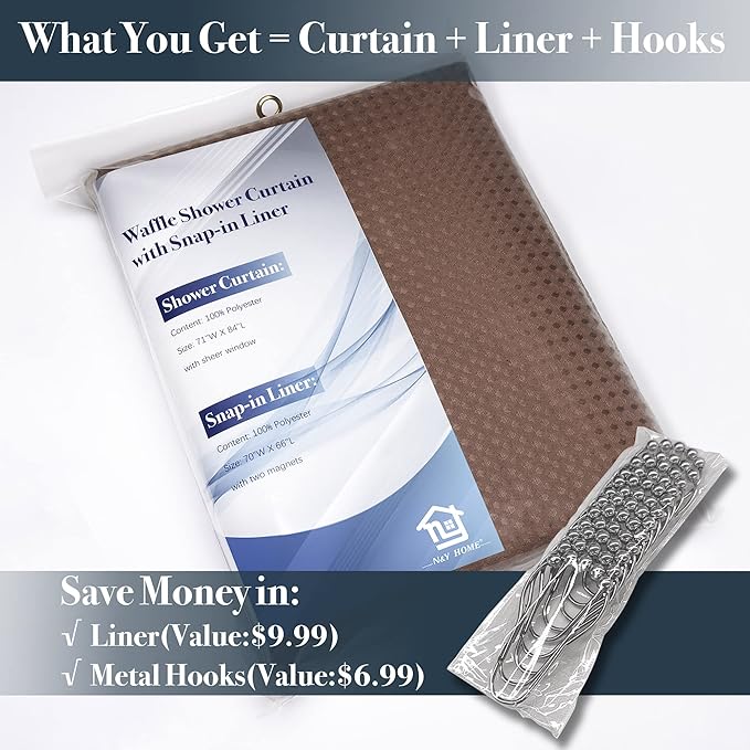 - Smart Design Set & Hotel Style: Waffle weave shower curtain with detachable fabric liner set, and free 12 rust resistant metal hooks, the entire 3-in1 set offers a complete solution for bathroom