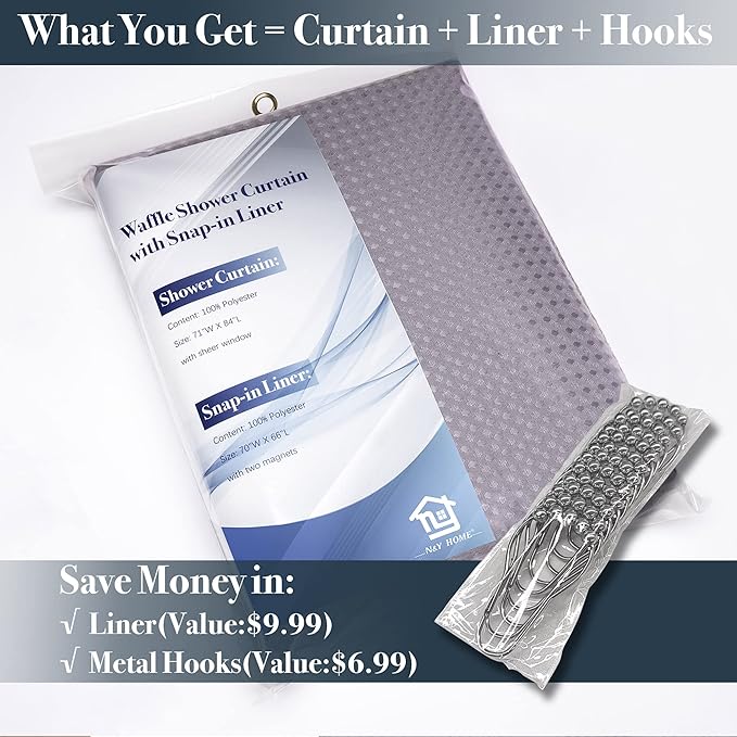 - Smart Design Set & Hotel Style: Waffle weave shower curtain with detachable fabric liner set, and free 12 rust resistant metal hooks, the entire 3-in1 set offers a complete solution for bathroom