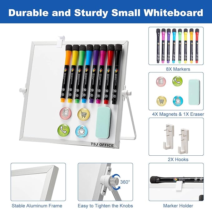 - TWO USAGES: Package included 8 markers, 4 magnets, 1 eraser, a removable marker holder and 2 hooks. You can simply install the hooks in the wall to hang this small white board, or just put it on the desktop.