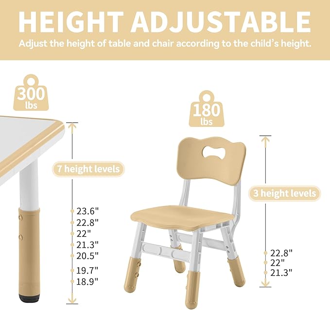 - 【HEIGHT ADJUSTABLE】:The table can be adjusted between 7 height levels (18.9" - 23.6") and can hold up to 330 lbs; The chair is adjustable in 3 positions (10.6" - 12.2") and has a maximum load capacity of 180 lbs.