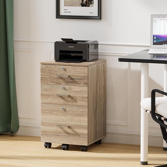 VINGLI 3-Drawer File Cabinet with Lock, Wood Rolling Filing Cabinets for Home Office, Mobile Printer Stand, Under Desk File Organizer for Letter Sized Files, 26" H(Caster Included), Oak