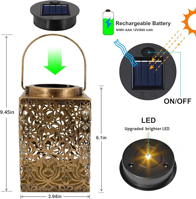 - Retro Solar Lanterns Outdoor Waterproof - Solidly built metal construction solar lantern with IP65 waterproof and be able to withstand outdoors year round, hold up all kinds of weather including rain and snow. There is a hole in the bottom of the lantern so it can be affixed to a table or bench with a screw. The outdoor lantern is solar, rechargeable, energy saving and environmental friendly.