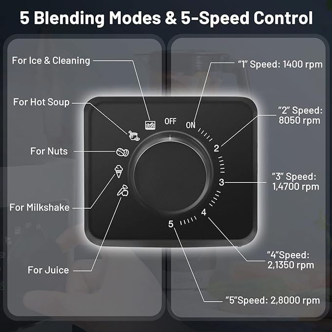 - 【5 Blending Modes & Speed :】Designed with 5 blending functions: ice, milkshake, hot soup, juice and nuts, our powerful blender allows you to choose your favourite modes according to your daily needs. Besides, 5-level speed control (1400 rpm-2,8000 rpm) enables you to freely adjust its blending speed.