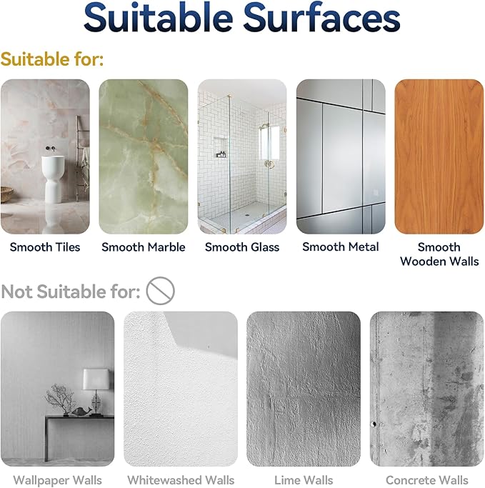- Suitable for Various Walls: Smooth tile, marble, tempered glass, wood wall, and solid metal are all suitable for installing this bathroom shower organizer. Suitable for bathroom, toilet, kitchen, powder room, etc. Wallpaper wall, stucco wall, lime wall, or concrete wall is not recommended. This corner shower caddy includes 2 × adhesive shower caddies, 1 × soap holder, 5 × adhesive stickers, 1 × user manual