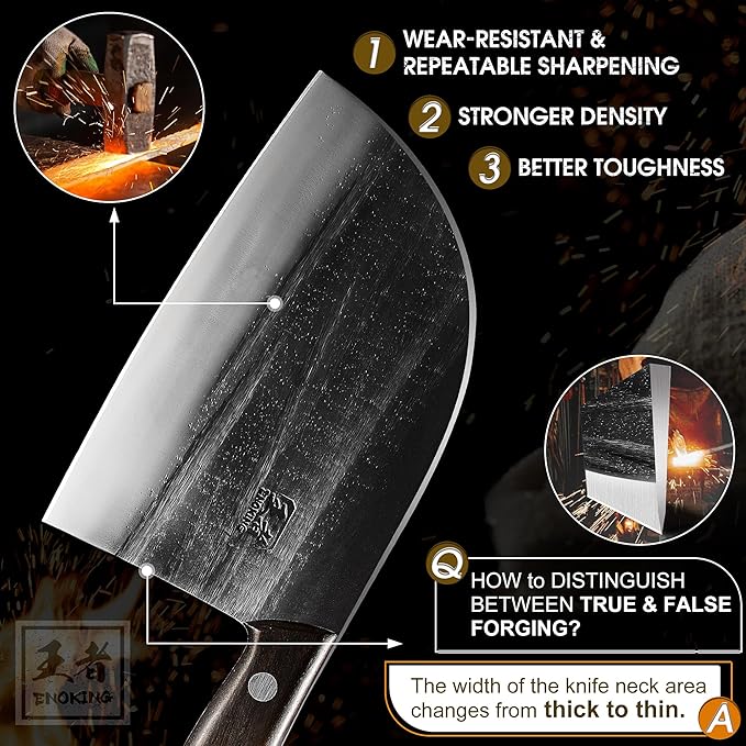 - Ancient Forging Process - ENOKING meat cleaver is forged by skilled craftsmens who forging knives many years, each Serbian chef knife will be hammering, quenching, high-temperature tempering, cyclic forging at least seven times, meantime we will eliminated unqualified knife to ensure every Enoking cleaver will work well.