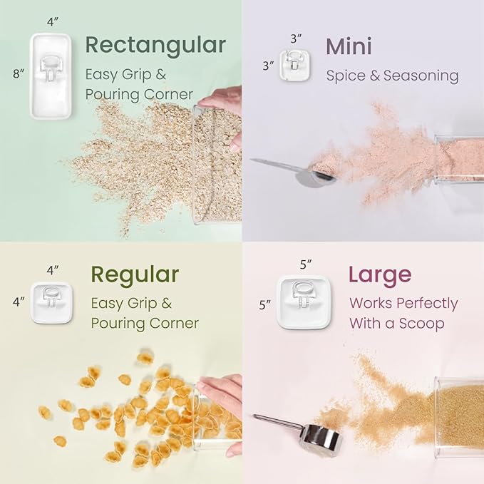 - AVAILABLE IN VARIOUS SIZES & SHAPES: The Felli Flip Tite container provides a wide variety of sizes and shapes, each designed to accommodate different types and amounts of food. The 4β REGULAR & RECTANGULAR sizes are ideal for small kitchen counter pantry organization, and their design ensures easy handling and pouring. The 5" LARGE size is perfect for storing powders that require scooping. Finally, the 6β XL size is specifically designed for bulk storage, making it versatile for various storage needs.