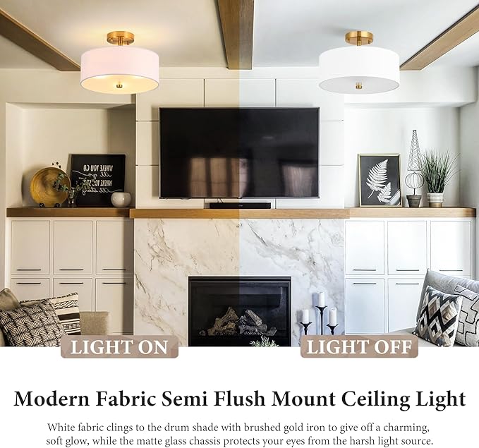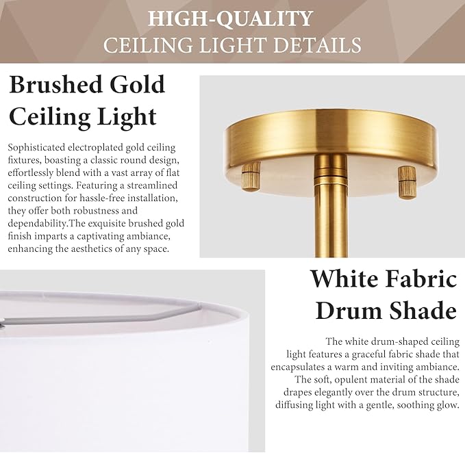- 【Elegant Drum Deign】 This modern flush mount ceiling light is crafted of the sturdy metal lamp body in an eye-catching brushed gold finish with fabric drum shade frosted tempered glass diffuser. It effortlessly combines polished shine with patches of subdued charm, provides an elegant look for any space.